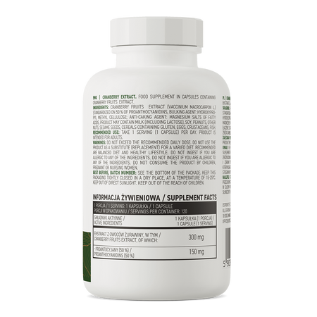 OstroVit Cranberry Extract est un complément alimentaire de haute qualité qui contient de l'extrait de fruit de canneberge standardisé à 50% de proanthocyanidines. Il s'agit d'une préparation végétalienne disponible sous forme de gélules faciles à avaler, conçue pour les personnes qui souhaitent compléter leur alimentation quotidienne avec des ingrédients précieux.