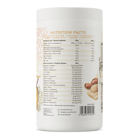 - Contient un complexe de vitamines et de minéraux - une portion contient 56,25 mg de magnésium, 300 mg de potassium, 12 mg de vitamine C et 2,1 mg de fer, 1,5 mg de zinc, 1,8 mg de vitamine E et 2,4 mg de niacine. Le produit contient également 0,3 mg de manganèse, 120 μg de vitamine A, 0,9 mg d'acide pantothénique et 0,15 mg de cuivre, ainsi que 0,21 mg de riboflavine, 0,21 mg de vitamine B6, 0,165 mg de thiamine, 6 μg de chrome, ainsi que 30 μg d'acide folique, 7,5 μg de biotine et 0,75 μg de vitamine D.