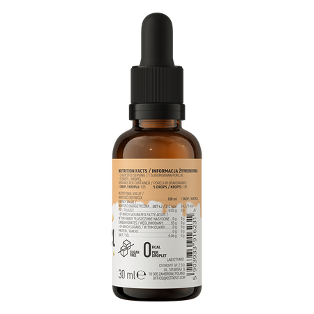 Les gouttes sucrantes au caramel sont un arôme alimentaire unique qui ne contient pas de sucre ajouté. Il s'agit d'un élément extrêmement efficace d'un menu sain, conçu pour les personnes qui souhaitent ajouter de la variété à leur alimentation quotidienne. Il s'agit d'un produit qui permet de transformer des boissons et des plats connus en créations culinaires savoureuses. Les gouttes sucrantes se distinguent par leur utilisation polyvalente et donnent aux boissons une saveur sucrée et fondante de caramel. Idéal pour aromatiser le café ou l'eau, donner aux liquides un arôme unique et rehausser le goût des flocons d'avoine, des crêpes ou des smoothies. Oubliez donc les boissons ennuyeuses et monotones. Choisissez l'arôme alimentaire OstroVit en gouttes et profitez de la plénitude d'un goût exceptionnel!