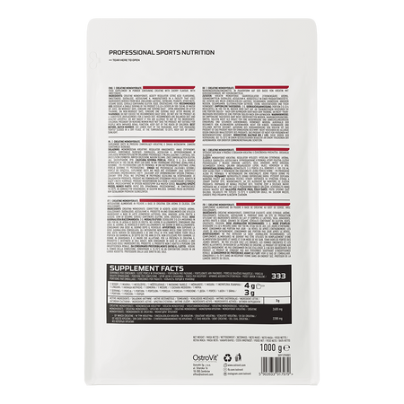 OstroVit utilise de la créatine monohydrate, c'est-à-dire la combinaison d'une molécule de créatine avec une molécule d'eau en une seule molécule - la créatine étant un composé hydrophile, elle se combine facilement avec l'eau et est donc une substance présentant une excellente biodisponibilité. La créatine monohydrate est la forme la plus simple de créatine en termes de structure, et en même temps le composé qui jouit de la plus grande popularité parmi les athlètes - elle est idéale pour les débutants dans un style de vie actif ainsi que pour les professionnels, en raison du fait que la créatine augmente la performance physique dans le cas d'exercices physiques successifs, courts et très intensifs, et les effets bénéfiques se produisent lorsque 3 g de créatine sont consommés quotidiennement.