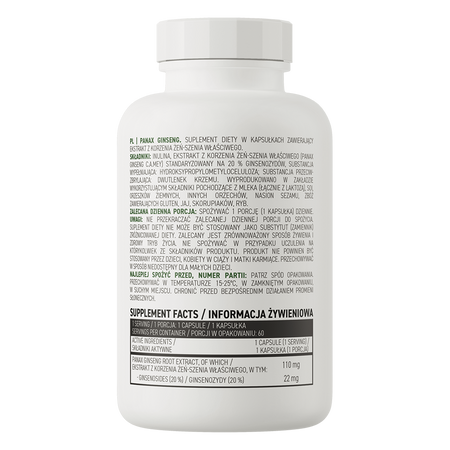 Ginseng proprement dit - plante de la famille des aralia, originaire d'Extrême-Orient, présente à l'état naturel principalement en Chine et en Corée. La racine de ginseng proprement dite, qui peut contenir jusqu'à 200 composés différents, est considérée comme une matière première riche en composants précieux. La substance la plus importante présente dans le rhizome de la plante est considérée comme étant les ginsénosides, c'est-à-dire des composés classés comme saponines, dont la teneur est standardisée dans l'extrait de ginseng utilisé dans OstroVit, ce qui a un effet positif sur la qualité du complément alimentaire.