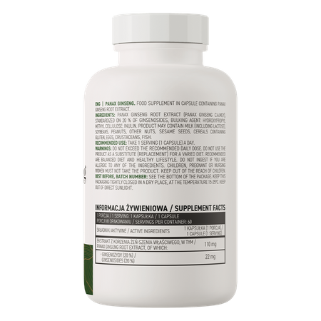 OstroVit Ginseng VEGE est un complément alimentaire de haute qualité qui contient un extrait de racine de ginseng standardisé à 20% de ginsénosides. Il s'agit d'une préparation végétalienne disponible sous forme de gélules faciles à avaler, conçue pour les consommateurs conscients qui souhaitent apporter un complément utile à leur régime alimentaire.