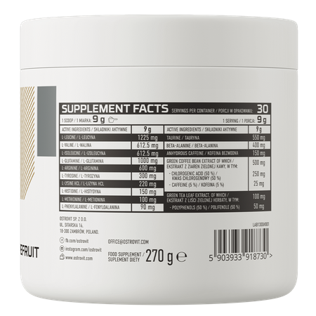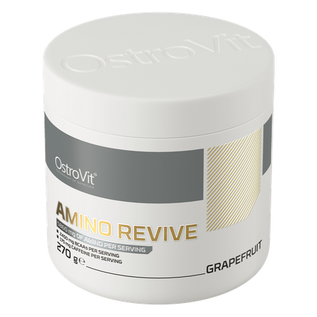OstroVit Amino Revive est un complément alimentaire de haute qualité qui contient un complexe d'acides aminés, ainsi que de la caféine, de l'extrait de grains de café vert et de l'extrait de feuilles de thé vert. Il s'agit d'une formule disponible sous forme de poudre avec un délicieux arôme de pamplemousse qui ne contient pas de sucre. Il s'agit d'un produit conçu pour les athlètes et les personnes physiquement actives qui souhaitent compléter leur alimentation avec des ingrédients de qualité.