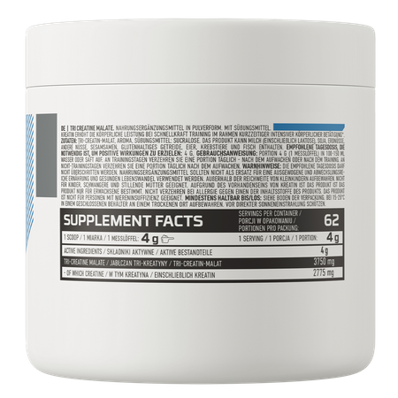 OstroVit utilise du malate de créatine, une combinaison 1:3 de la molécule de créatine avec de l'acide malique. C'est l'une des formes les plus solubles du composé, qui se distingue par sa grande stabilité et sa résistance aux enzymes gastriques, ainsi que par son excellente biodisponibilité dans le corps humain. Malate de créatine contribue nettement moins que le monohydrate à la rétention d'eau dans l'organisme, ce qui le rend très populaire auprès des athlètes de diverses disciplines.