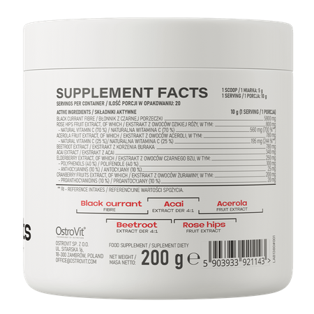 - Source d'ingrédients précieux - une portion du complément alimentaire apporte à l'organisme 5800 mg de fibres de cassis, 800 mg d'extrait de cynorrhodon standardisé à 70% de vitamine C naturelle, 780 mg d'extrait de fruit d'acérola standardisé à 25% de vitamine C naturelle, ainsi que 780 mg d'extrait de racine de betterave et 340 mg d'extrait d'açaï. La préparation contient également 250 mg d'extrait de fruit de sureau standardisé à 40% de polyphénols et 10% d'anthocyanes et 200 mg d'extrait de fruit de canneberge standardisé à 10% de proanthocyanidines.