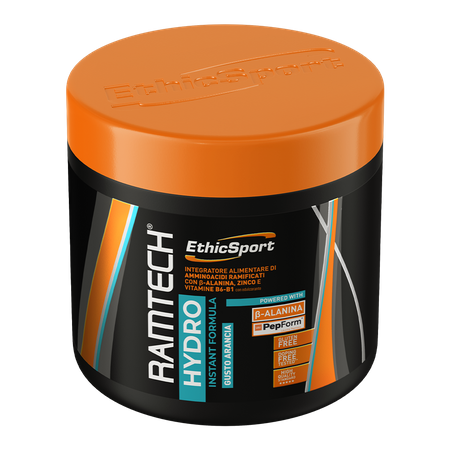 EthicSport Ramtech® Hydro est un complément alimentaire sous forme de poudre au goût rafraîchissant d'orange et de citron. Ce produit a été développé pour les sportifs et les personnes qui s'entraînent intensivement et qui souhaitent compléter leur alimentation avec des acides aminés BCAA, de la bêta-alanine et une sélection de vitamines et de minéraux.
