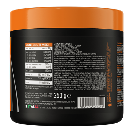 BCAA 2:1:1, fructooligosaccharides, régulateur d'acidité: acide citrique; β-alanine, arômes, Pepform leucine® (protéines de lactosérum hydrolysées du lait, L-leucine) 40% L-leucine totale, anti-agglomérant: Dioxyde de silicium; édulcorant: sucralose; émulsifiant: esters de saccharose d'acides gras; gluconate de zinc, colorant: carotènes; pyridoxal-5-phosphate (vitamine B6), chlorhydrate de thiamine (vitamine B1).