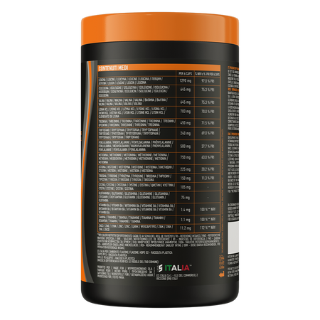 Acides aminés ramifiés BCAA (L-leucine, L-valine, L-isoleucine, émulsifiant: lécithines), chlorhydrate de L-lysine, L-méthionine, L-phénylalanine, L-thréonine, L-tryptophane, L-histidine, L-tyrosine, chlorhydrate de L-cystéine, inuline, L-glutamine, picolinate de zinc (zinc), chlorhydrate de pyridoxine (vitamine B6), chlorhydrate de thiamine (vitamine B1), anti-agglomérants: sels de magnésium d'acides gras, dioxyde de silicium.