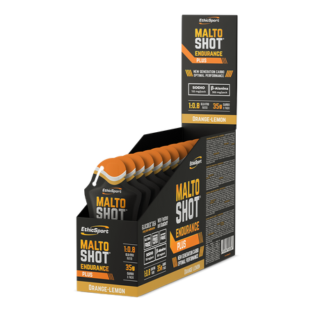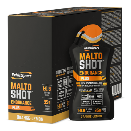 La formule du produit MaltoShot® Endurance PLUS repose sur des glucides à profil d'absorption varié, provenant de cinq sources, dont la cyclodextrine ramifiée SusCarb® obtenue par transformation enzymatique de l'amidon. Ce complément au délicieux goût d'orange et de citron contient un rapport glucose/fructose de 1:0,8. La composition du produit a été complétée par des minéraux tels que le sodium et le magnésium, ainsi que par de la bêta-alanine, un composé chimique organique appartenant au groupe des acides aminés non protéiques. Le produit ne contient pas de caféine ajoutée.