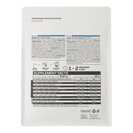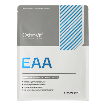 Le complément alimentaire OstroVit EAA est une préparation à base d'acides aminés essentiels EAA. Il s'agit de substances que l'organisme humain ne peut pas produire lui-même et qui doivent donc être apportées par l'alimentation quotidienne ou sous forme de compléments alimentaires. Ce groupe de composés comprend les acides aminés ramifiés BCAA, dont la L-leucine, la L-valine et la L-isoleucine. Le complément OstroVit EAA contient également d'autres substances précieuses telles que la L-thréonine, la L-lysine, la L-méthionine, la L-phénylalanine, la L-arginine, le L-tryptophane et la L-histidine.