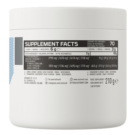 OstroVit utilise le malate de citrulline, une forme du composé qui se distingue par son excellente biodisponibilité et son ergogénicité, ce qui a un effet positif sur la qualité de la préparation et l'efficacité de la supplémentation.